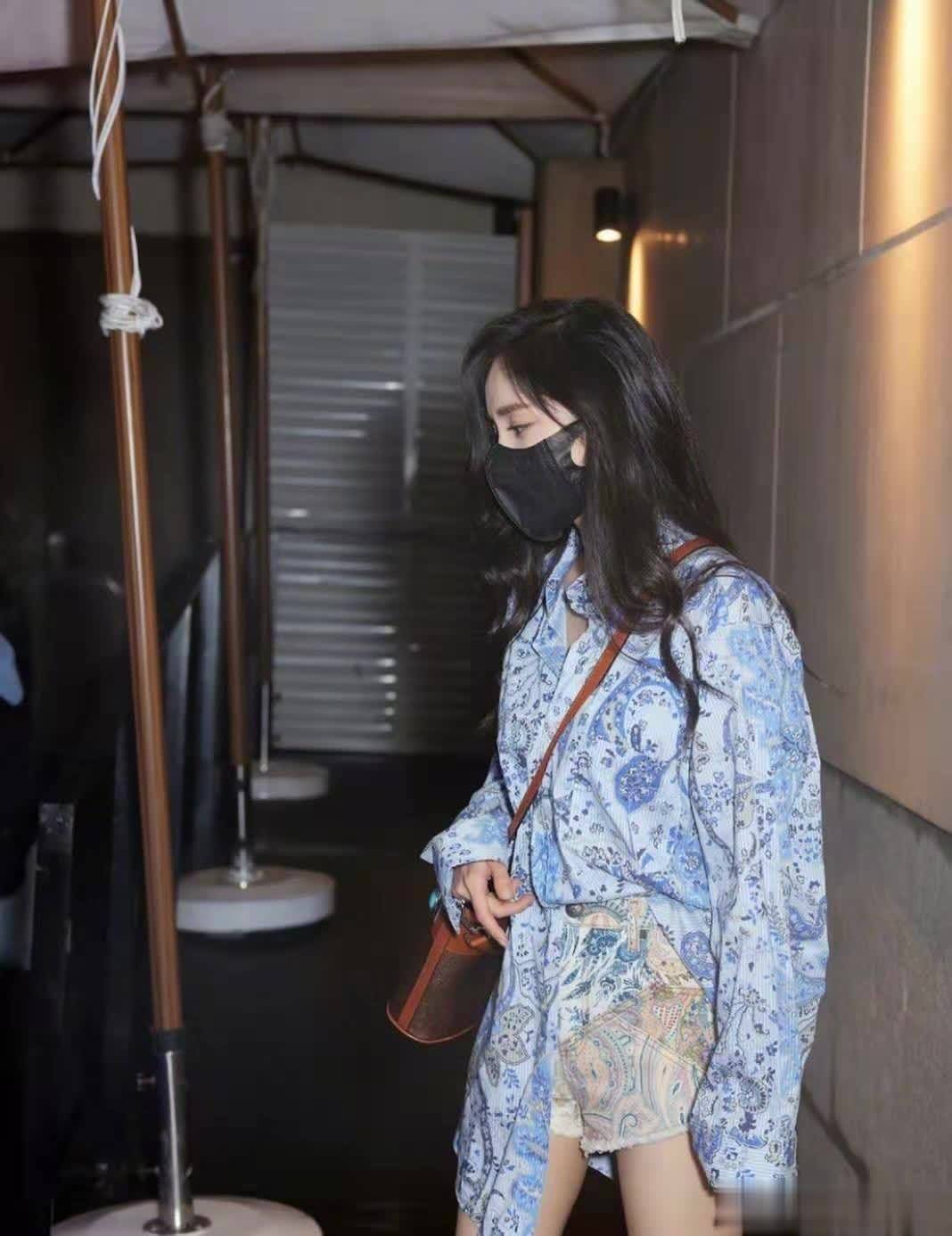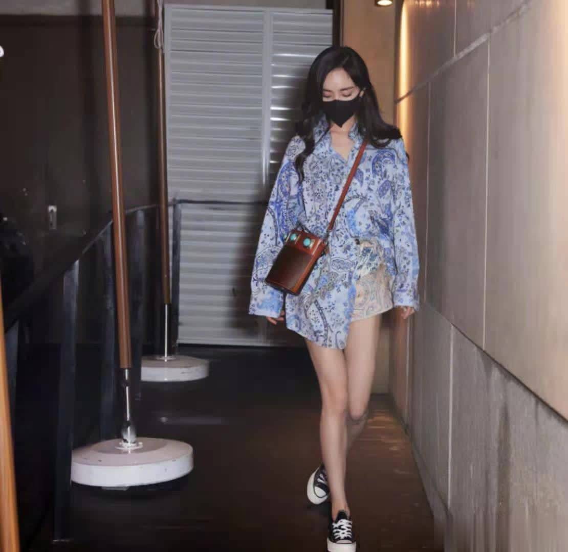 杨幂搭配的是印花短裤,单看这条印花短裤,给人一种花里胡哨的感觉,但与印花衬衫组合在一起,非但不显花哨,还显得整体造型和谐统一,演绎出不费力的时尚感。印花衬衫照着杨幂这么搭,想不时尚都难。