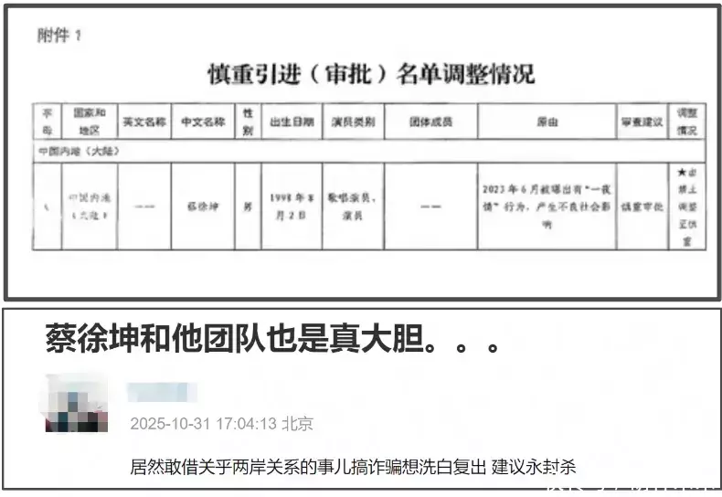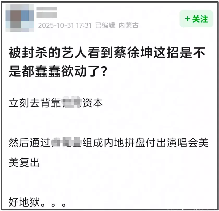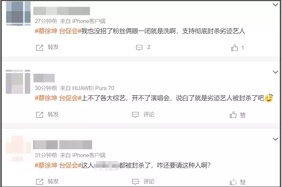 在网友看来,这属于严重投机行为,而且还是在两岸交流演出上耍小聪明,网友纷纷呼吁台促会抓紧时间维权追责、及时止损吧,先把蔡徐坤限制演出状态调整回来,让他继续被封杀着吧!
