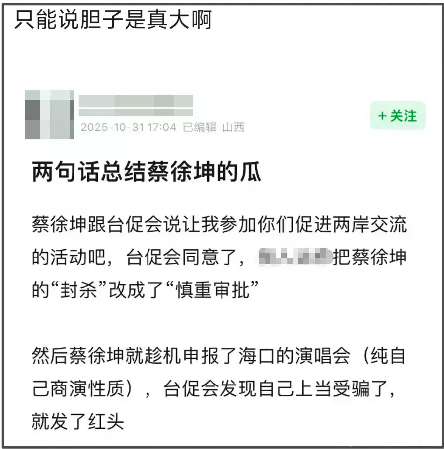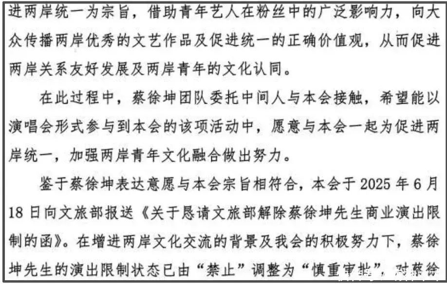 2025年8月,蔡徐坤被允许参加两岸交流演唱会;2025年9月,台促会得知其他演艺公司申报了蔡徐坤演唱会项目,两场演唱会位于同一地点,都在海南省海口市。