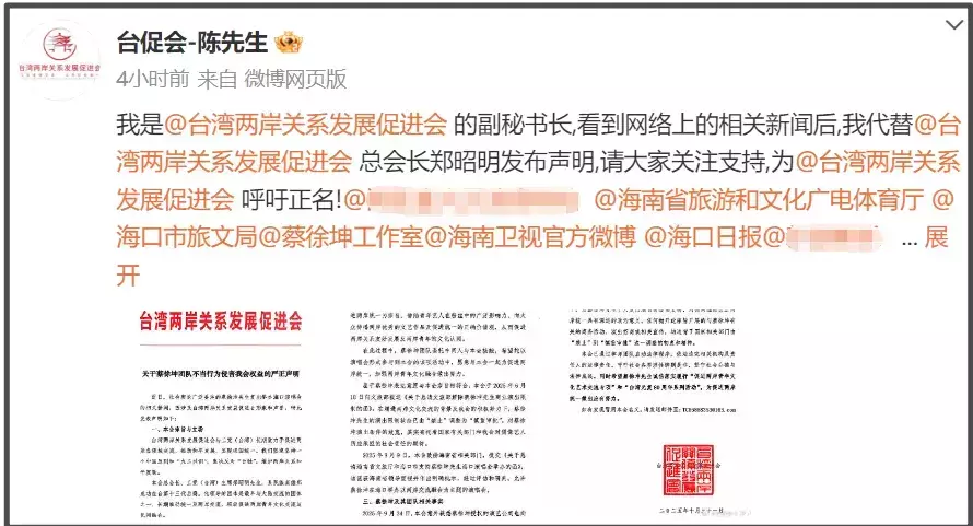 这里简单总结一下声明重点,台促会为了促进两岸文化交流计划举办一系列活动,蔡徐坤团队主动与他们接触,希望与台促会一起举办以两岸交流融合为主题的演唱会,期间台促会努力推动了蔡徐坤限制演出状态调整,让他从“禁止”变成了“谨慎审批”。