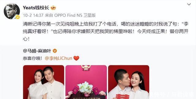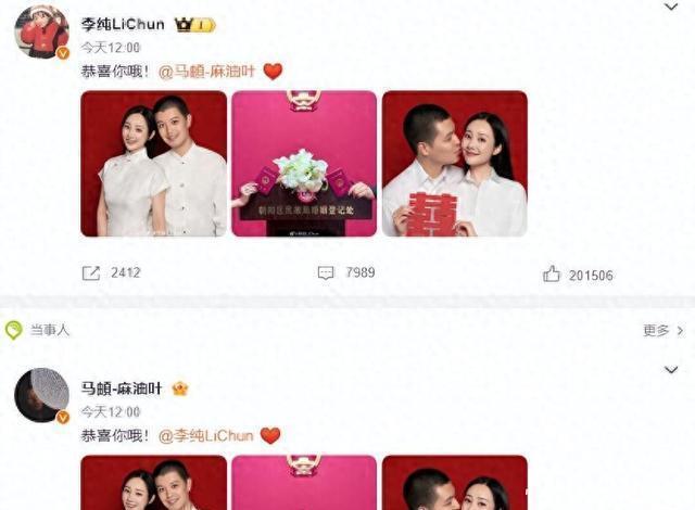 从甜度爆表到当街开怼,这对新婚小两口的日常,简直就是现实版婚姻图鉴。 10月2日12点整,演员李纯和民谣歌手马頔在朋友圈和微博齐刷刷甩出结婚照,配文"恭喜你哦!"——短短四个字,直接甜度超标,吃瓜群众瞬间炸锅。这对从官宣恋情到领证只用了一年多的小情侣,用最硬核的方式向全世界宣告:我们锁了!