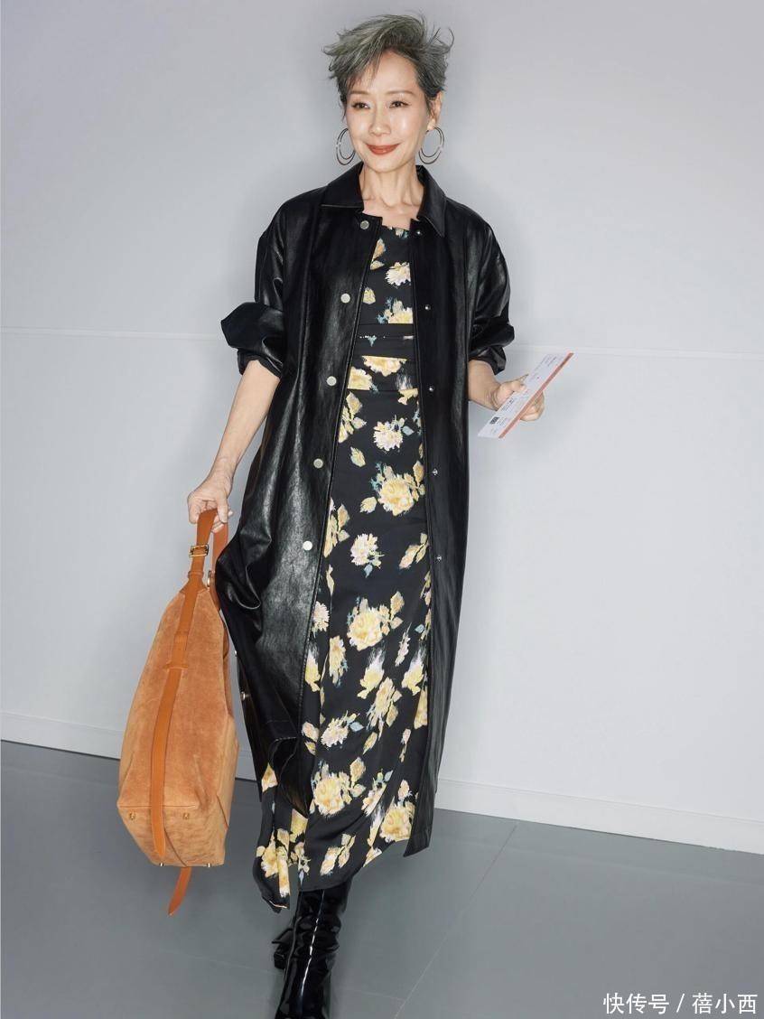 黑色皮衣配连衣裙很有新意,皮质面料难免给人严肃感,而休闲风连衣裙常与优雅、知性联系在一起。叶童身上是印花裙,从颜色上看不挑穿着者年纪,主要关注点是裙长。